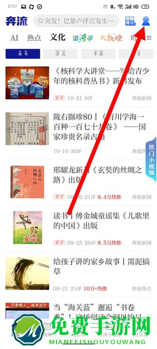 1、打开奔流新闻,点击页面右上角的个人图标。