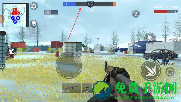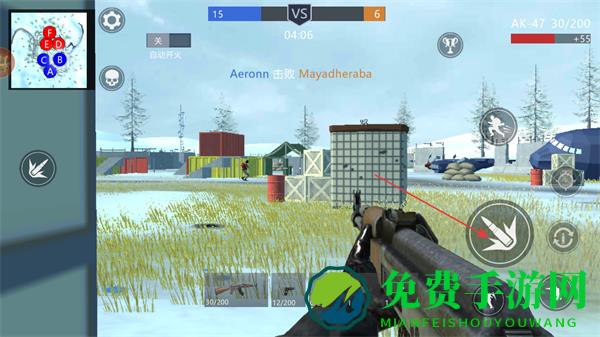 1、通过左侧虚拟摇杆移动,右侧按键射击,使用AK-47武器在雪地场景中战斗。