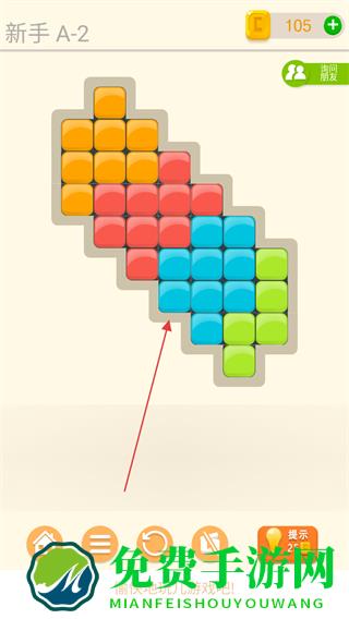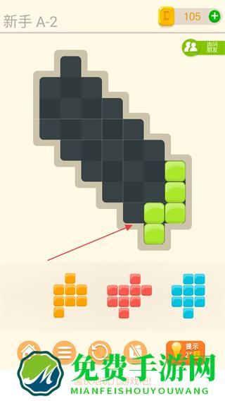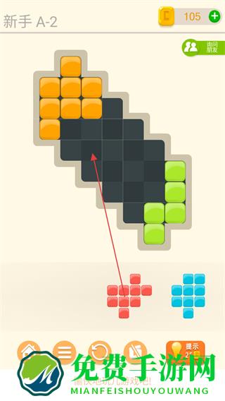 1、观察游戏区域的黑色空格形状,选择下方对应形状的彩色方块如橙色、红色、蓝色方块。