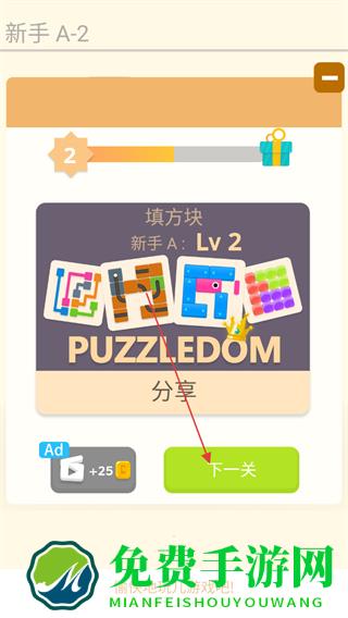 4、完成填充后,即可通关,点击“下一关”继续挑战更复杂的填方块谜题。