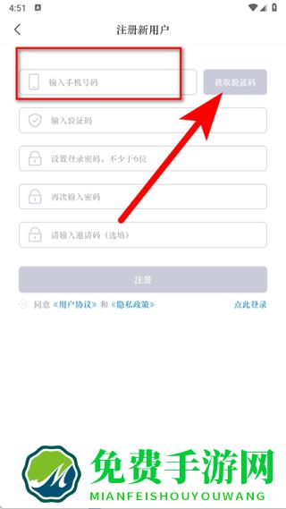 4、在注册新用户页面,输入手机号码,点击获取验证码。