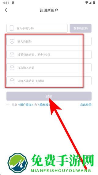 5、输入验证码,设置登录密码,再次输入密码,填写邀请码,勾选同意后,点击注册,完成新用户注册。