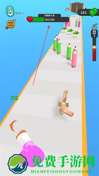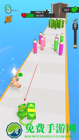 1、在跑道上操控武器如剑,切割彩色铅笔等物体,获取金币奖励。