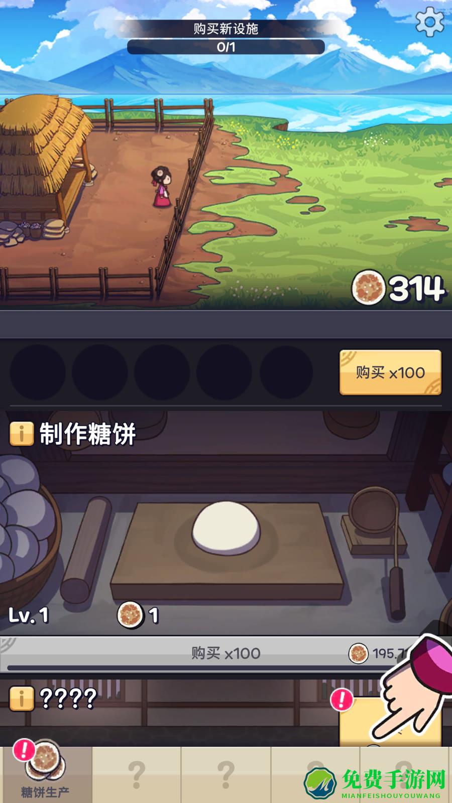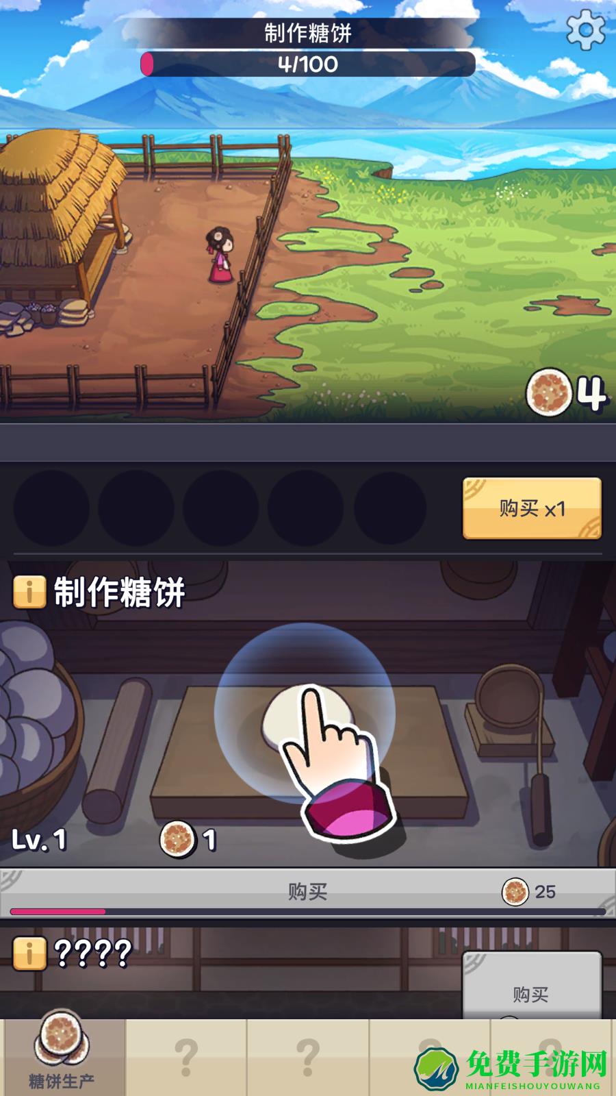 1、进入游戏后,找到制作糖饼的区域,点击该区域开始制作糖饼,初期点击一次可制作一个糖饼,随着游戏等级提升,制作糖饼的速度会逐渐加快。