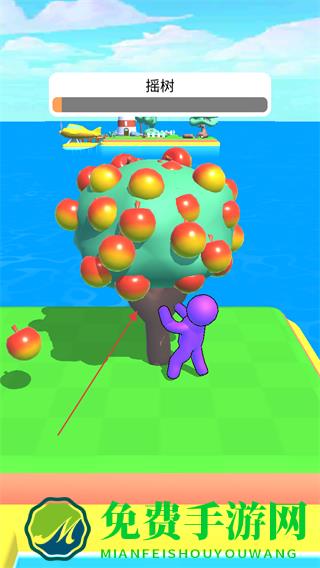 1、操作紫色角色摇树,收获苹果,积累水果资源。