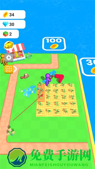 2、操控紫色角色在农田中开垦土地,为种植作物做准备。