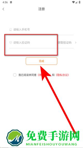 5、输入收到的验证码,勾选同意后,点击完成,完成账号注册。