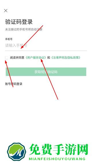 2、在验证码登录页面输入手机号,勾选协议后,点击获取短信验证码。