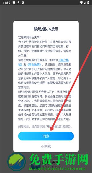 1、在雨后天气的“隐私保护提示”弹窗点击“同意”,进入福州市天气主界面。