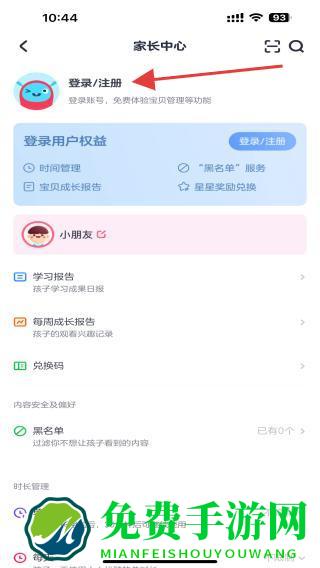 1、打开优酷少儿APP,进入到首页切换家长模式,在家长中心页面点击登录/注册的按钮。