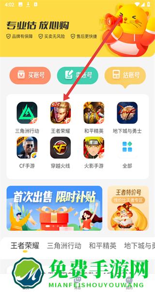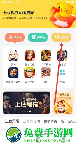 1、在游戏账号交易APP主界面点击“估账号”,进入游戏选择页面。