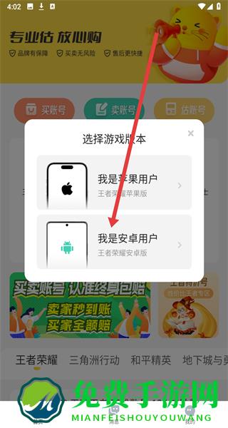 3、在选择游戏版本弹窗中点击“我是安卓用户”,进入王者荣耀安卓版账号估价页面。