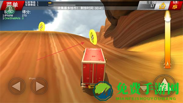 4、在规定时间内,驾驶车辆在沙漠中快速移动,收集更多钱币,完成任务目标。