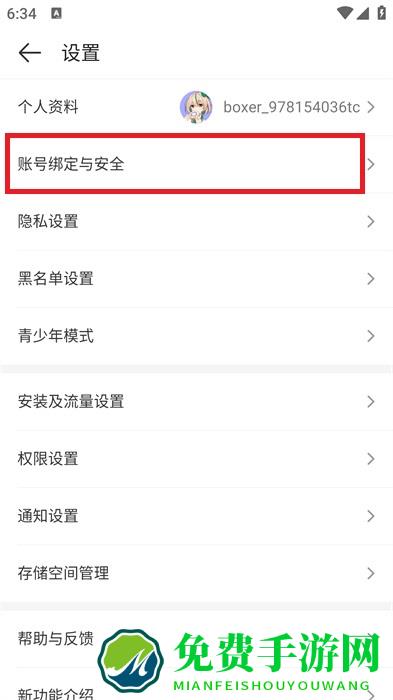 3、在设置页面,能够看到【账号绑定与安全】,进入到其中去修改;
