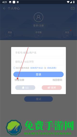 3、在登录注册界面,点击快速注册选项,进入安智账号注册页面。