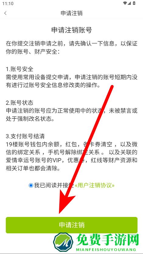 5、在申请注销页面,勾选同意协议点击申请注销按钮,完成账户注销操作。