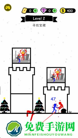1、在Level2中,目标是寻找宝藏,操控蓝色火柴人,与红色敌人战斗。