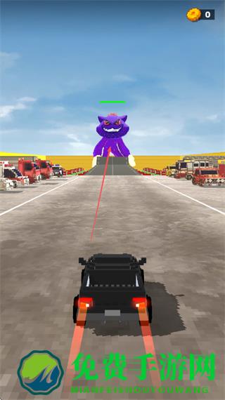 1、驾驶车辆在赛道上行驶,朝着紫色巨型怪物的方向前进。