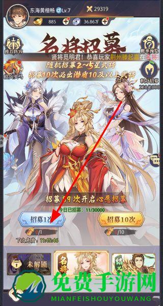 1、进行招募操作,可选择招募1次或10次,随机获得2到5星武将,积累武将阵容。