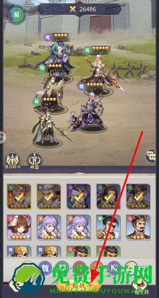 2、布置角色阵容,选择合适的武将组合,点击开始战斗,开启三国对战之旅。
