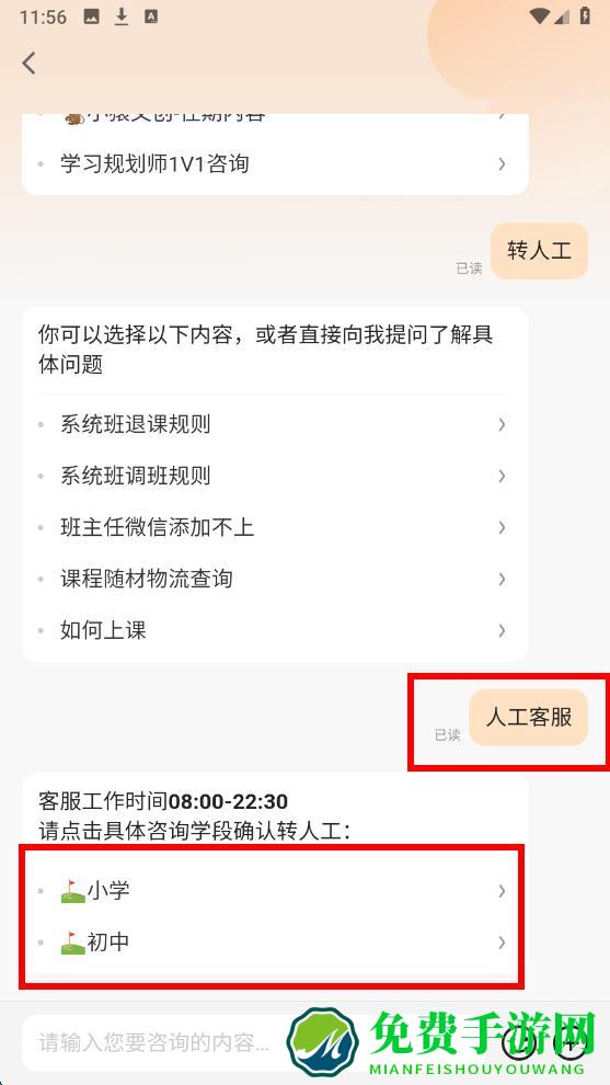 4、在对话界面中发送人工客服,然后根据学段选择小学或者初中等相应选项,即可联进行咨询。