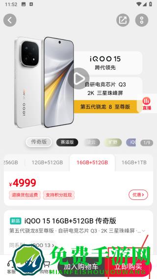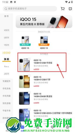 3、在旗舰系列手机列表页面,点击iQOO-15-16GB+512GB传奇版手机条目,进入手机详情页面。