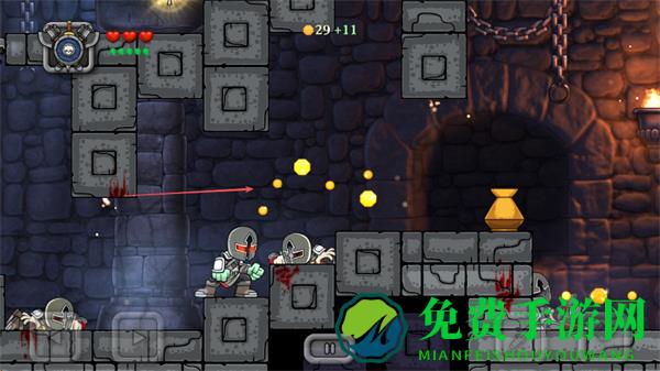 1、操控角色在城堡场景中移动,攻击骷髅类敌人,收集金币。