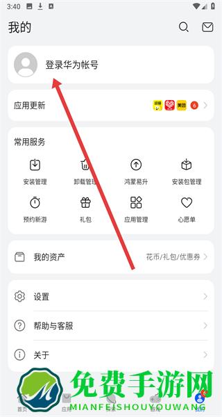 1、在华为应用市场首页点击右下角“我的”,进入个人中心页面。