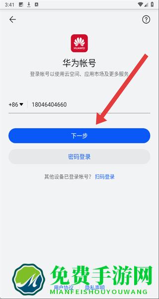 3、在华为帐号登录界面点击“下一步”,进入短信验证码输入页面。