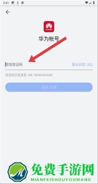 4、在短信验证码输入页面输入收到的验证码,完成华为帐号登录操作。