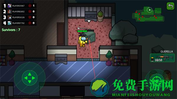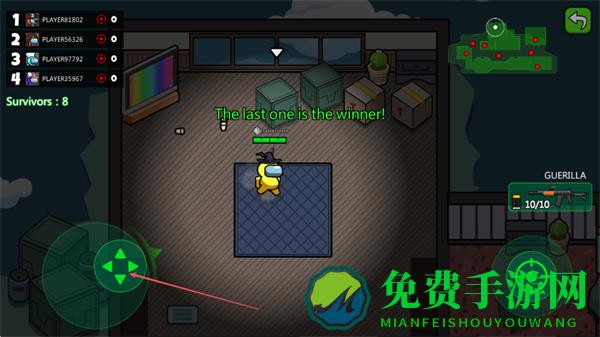1、用左侧摇杆操控黄色角色移动,在房间内探索,收集武器,目标成为最后存活者。
