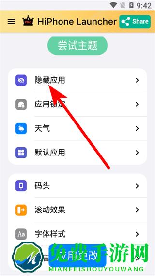 1、在HiPhone Launcher设置页面,点击隐藏应用选项,进入隐藏应用设置页面。