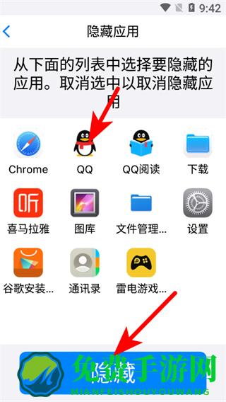 3、在应用选择页面,选择想要隐藏的应用,点击隐藏按钮。