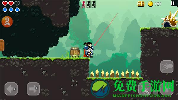 1、操控勇士在像素场景中,注意躲避火焰陷阱,瞄准高处敌人,准备发起攻击。