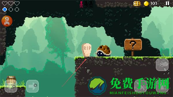 2、探索带问号木牌区域,躲避蜗牛敌人,留意“RIP”标识的危险区域,继续前进。