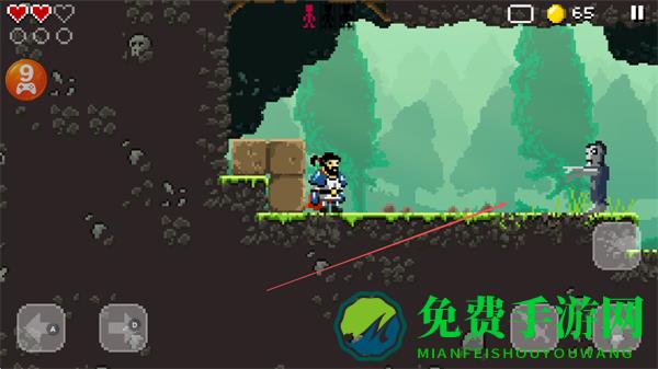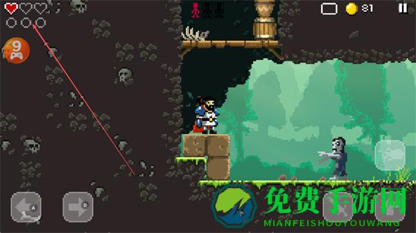 4、在多平台洞穴中移动,躲避骷髅装饰的危险区域,攻击僵尸敌人,收集金币,推进关卡。