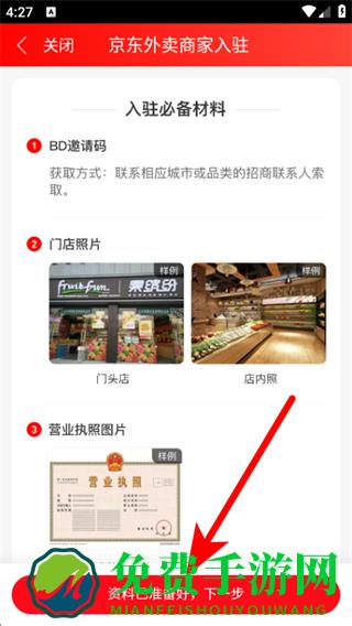 2、进入京东外卖商家入驻流程,这里点击资料已准备好,下一步。