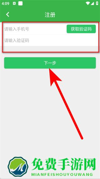 4、输入手机号,点击获取验证码,输入验证码后点击下一步,完成注册操作。