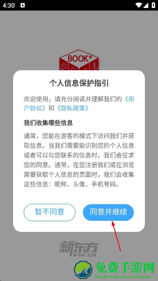 1、打开书加加App,在个人信息保护指引页面,点击“同意并继续”按钮。