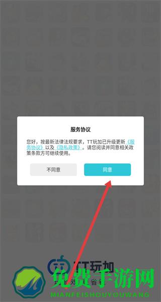 1、在打开TT玩加App后,通过点击服务协议弹窗中的同意按钮,进入使用。