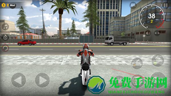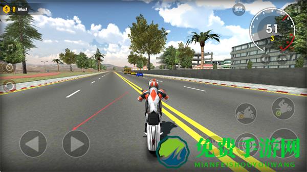 1、点击右侧加速按钮提升摩托车速度,在城市道路上行驶,注意躲避其他车辆。