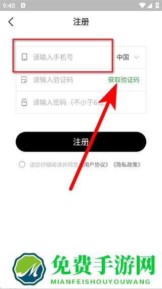3、在注册页面,输入手机号后,点击获取验证码。