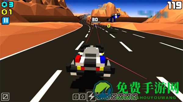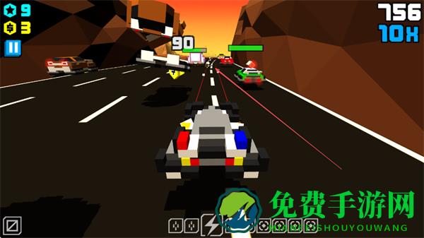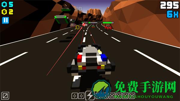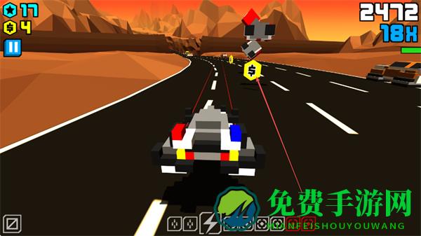 1、操控像素警车在公路上行驶,躲避其他车辆,收集金币和道具,积累分数。