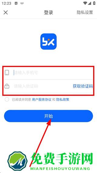 3、在登录页面,输入手机号和验证码,点击开始,完成登录操作。