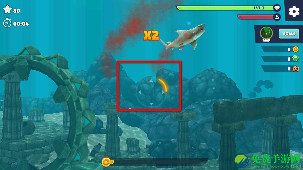 2、进入游戏后,通过滑动屏幕控制鲨鱼的移动方向,灵活操控鲨鱼在海洋中穿梭。