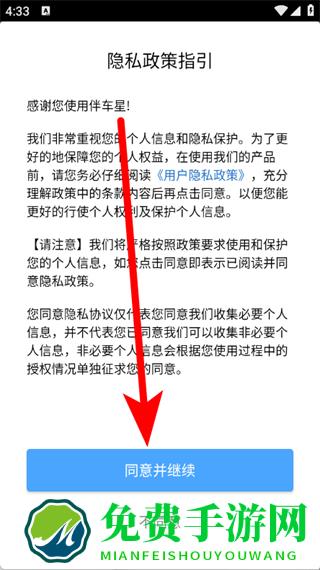 1、打开伴车星,在隐私政策指引弹窗,点击同意并继续。
