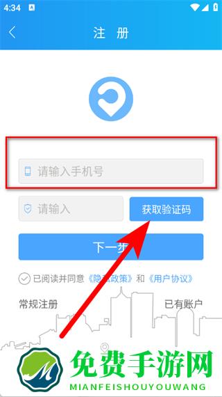 3、在注册页面,输入手机号,点击获取验证码。
