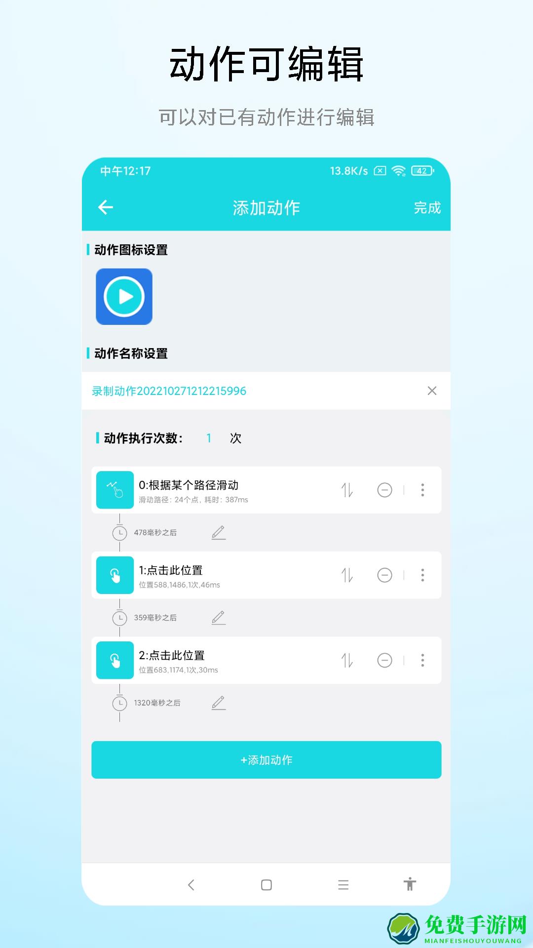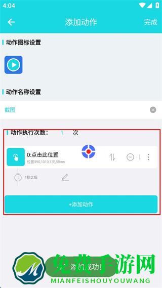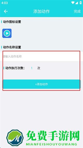 2、在添加动作界面,输入动作名称,设置动作执行次数后点击“+添加动作”按钮。