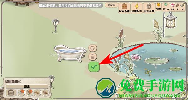 3、在编辑模式下布置好家具后,点击绿色对勾按钮确认布置,完成家园装饰操作,为青蛙打造舒适居住环境。