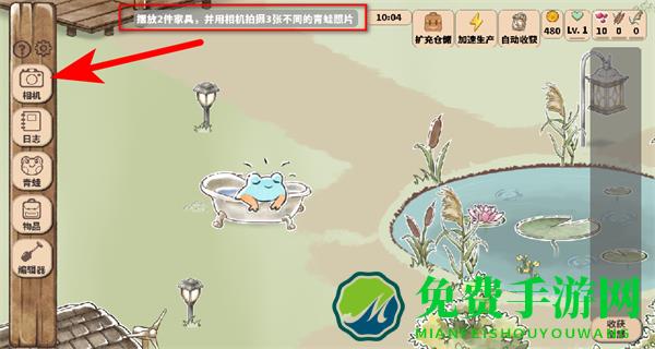 4、点击左侧菜单的相机功能,按照任务要求拍摄青蛙照片,完成拍摄不同青蛙照片的任务,推进游戏进程。